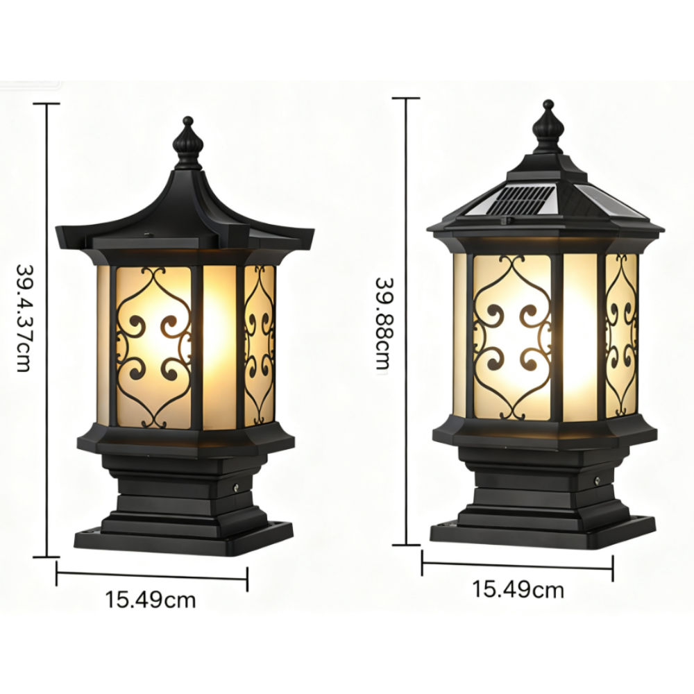 This European-style retro lantern outdoor gate pillar light blends timeless aesthetics with advanced functionality, offering two power supply options—solar-powered and wired—to meet diverse lighting needs. The solar version has a high-efficiency polycrystalline photovoltaic panel (6-hour charge time) and remote-controlled 3-color temperatures (3000K, 4500K, 6000K), while the wired version features a standard E26 bulb base and a warm 3000K bulb. Crafted from thick die-cast aluminum with an anti-corrosion electrostatic coating and a frosted glass shade, it holds an IP54 rating for water and dust resistance, ensuring all-weather reliability. Available in classic black or antique bronze finishes, it’s perfect for illuminating villas, garden walkways, and residential paths, combining durability, functionality, and elegant design.